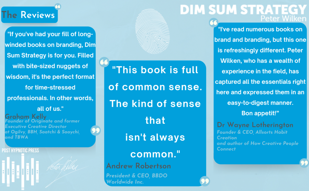 Dim Sum Strategy presents a carefully curated selection of proven strategic tools, with insights and anecdotes from three decades working with some of the world’s leading brands at the world’s top agencies. The book is structured to follow the author’s proven Brand Centered Management(TM) process, with a smattering of different “tools” split into four parts: Discovery, Definition, Direction, and Delivery. Each tool is presented in bite-sized, standalone chunks; you can read the book in stepwise fashion or cherry-pick in whatever order you wish–just like a dim sum meal.